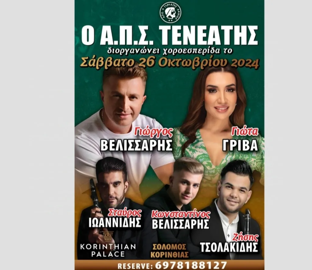 Ο Α.Π.Σ Τενεάτης διοργανώνει χοροεσπερίδα το Σάββατο 26/10 στο Korinthian Palace, στο Σολομό Κορινθίας.