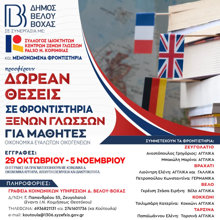Ο Δήμος Βέλου – Βόχας σε συνεργασία με το Σύλλογο Ιδιοκτητών Κέντρων Ξένων Γλωσσών PALSO Ν. Κορινθίας καθώς και Μεμονωμένα Φροντιστήρια Ξένων Γλωσσών, που εδρεύουν σε διάφορες Κοινότητες του Δήμου, προσφέρουν δωρεάν θέσεις παρακολούθησης μαθημάτων Ξένων Γλωσσών σε απόρους και οικονομικά αδύναμους μαθητές. Για το λόγο αυτό, καλούν τους ενδιαφερόμενους να προβούν στην κατάθεση των αιτήσεων τους στα γραφεία των κοινωνικών υπηρεσιών του Δήμου.